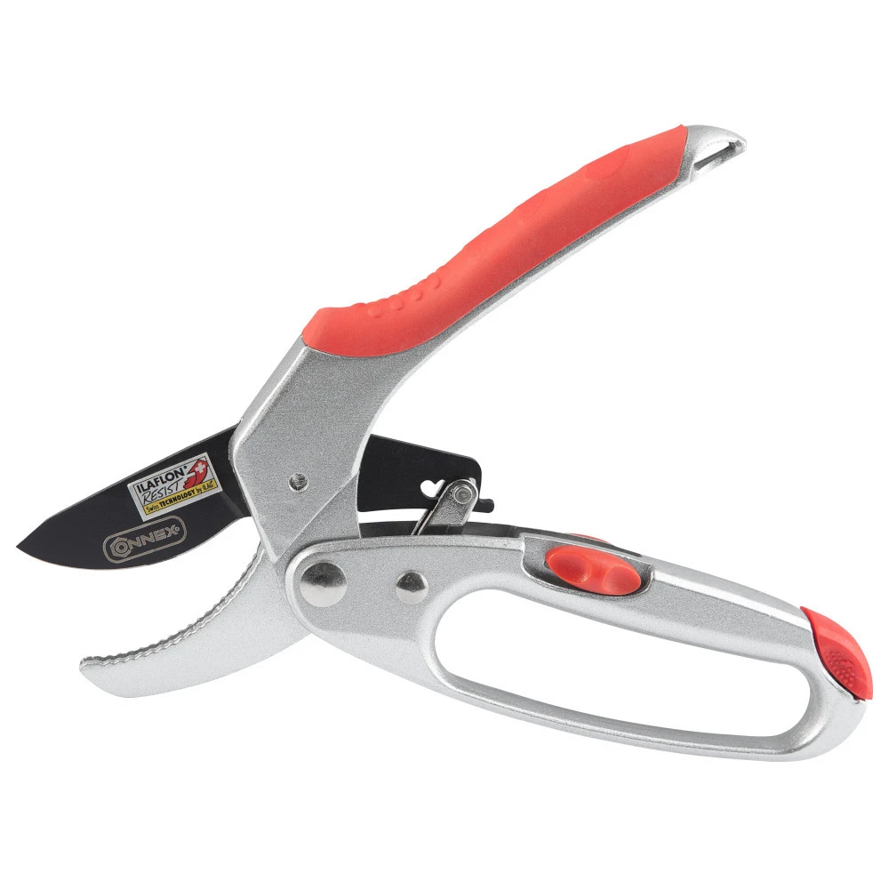 Die Ratschen-Gartenschere eignet sich zum effektiven Schneiden von stärkeren Ästen, Zweigen mit größerem Durchmesser und frischem Holz. Ausgestattet mit einer antihaftbeschichteten Klinge aus Carbon-Stahl bietet diese Schere beste Schnittergebnisse. Somit ist es möglich Äste mit deinem Durchmesser von bis zu 10 mm zu durchtrennen. Die ergonomisch ausgeformten Griffe mit eingearbeiteten Weichkomponenten sorgen für Komfort und die nötige Rutschfestigkeit. Dank des Einhand-Sicherheitsverschlusses kann die Astschere einfach geschlossen und sicher aufbewahrt werden. Zusätzlich lassen sich verbrauchte Klingen schnell und einfach auswechseln.